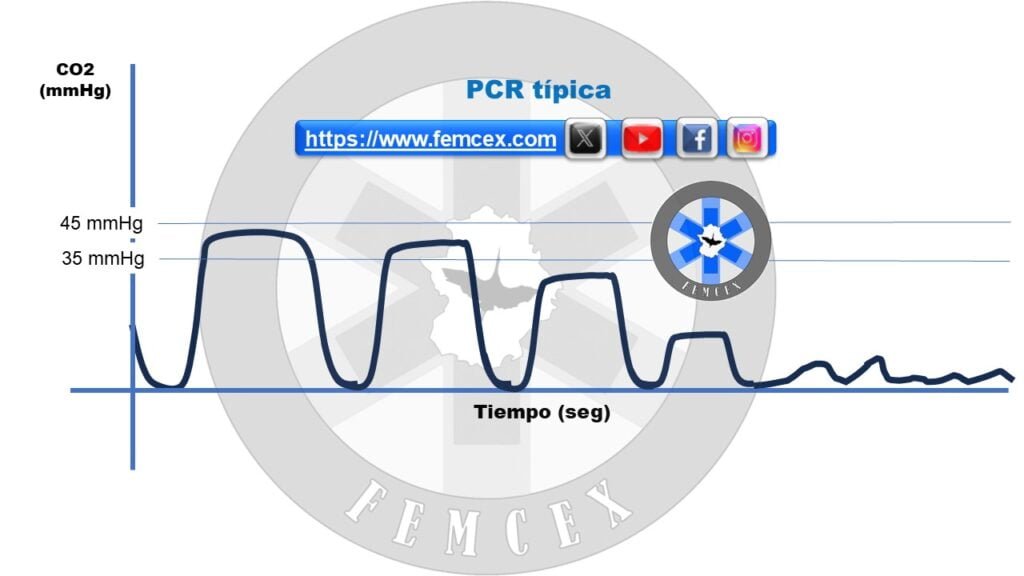La capno-X (35 – 45mmHg) es representativa del estado ventilatorio del paciente. Es fácil, rápida, sencilla, casi inmediata, se antepone a cualquier otra valoración mediante dispositivos (pulsioxímetro, tensiómetro, electro…) en nuestra valoración X-ABCDEF. Su uso en la parada no sólo te indicará sospecha de la misma, te orientará a causa, te orientará a calidad de la misma y necesidad de cambio de reanimador.